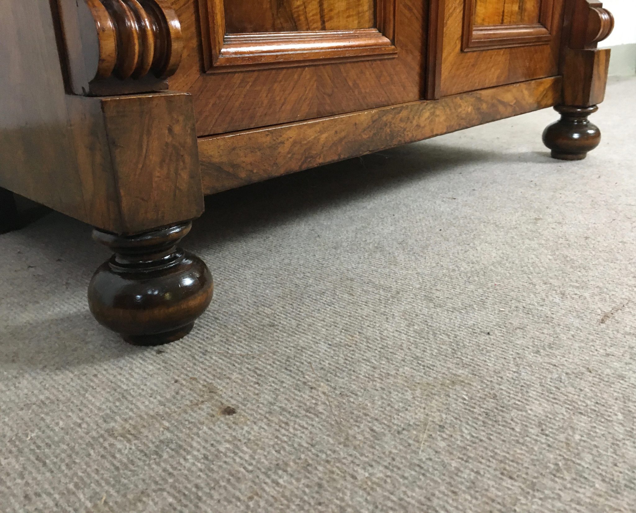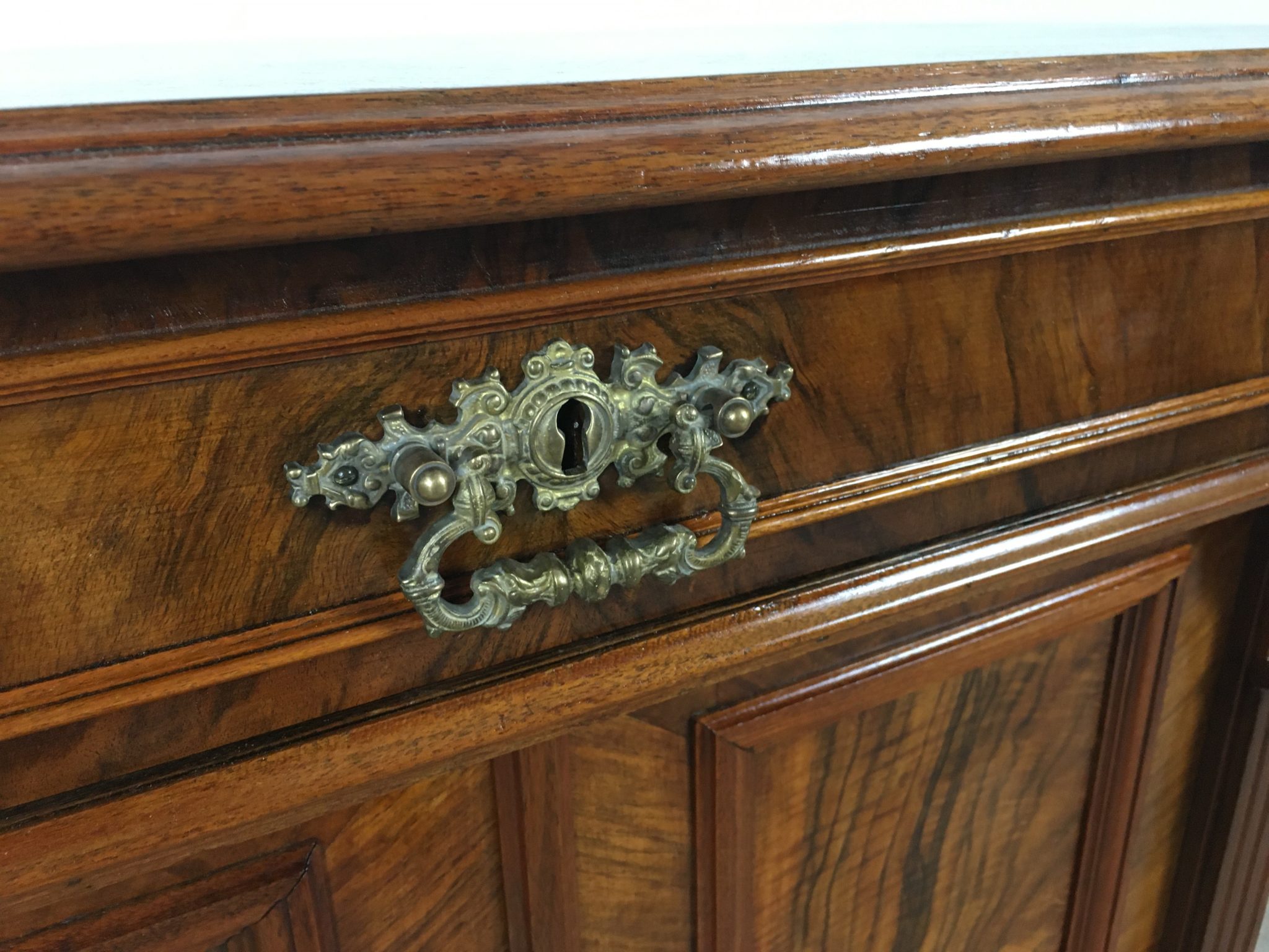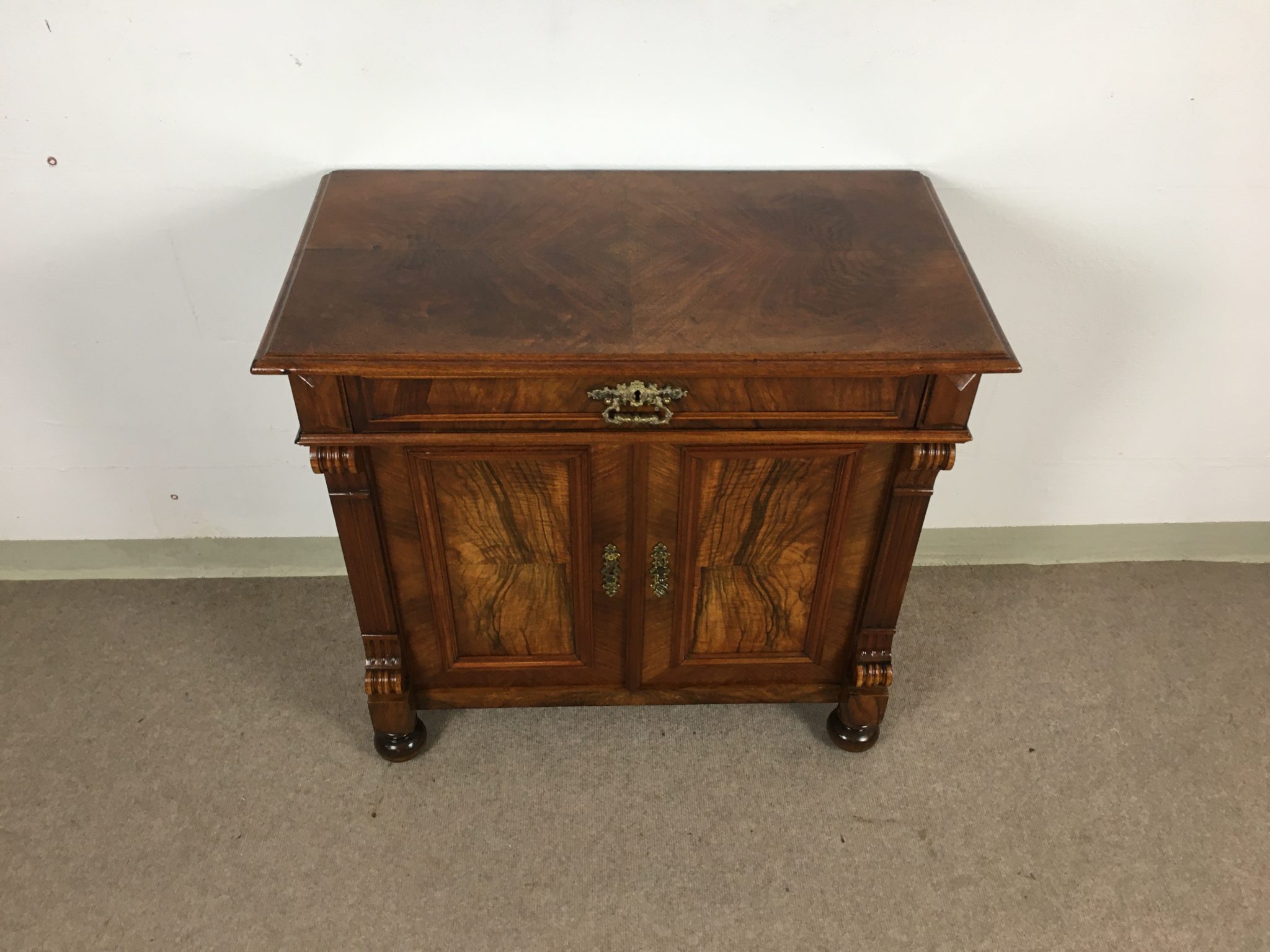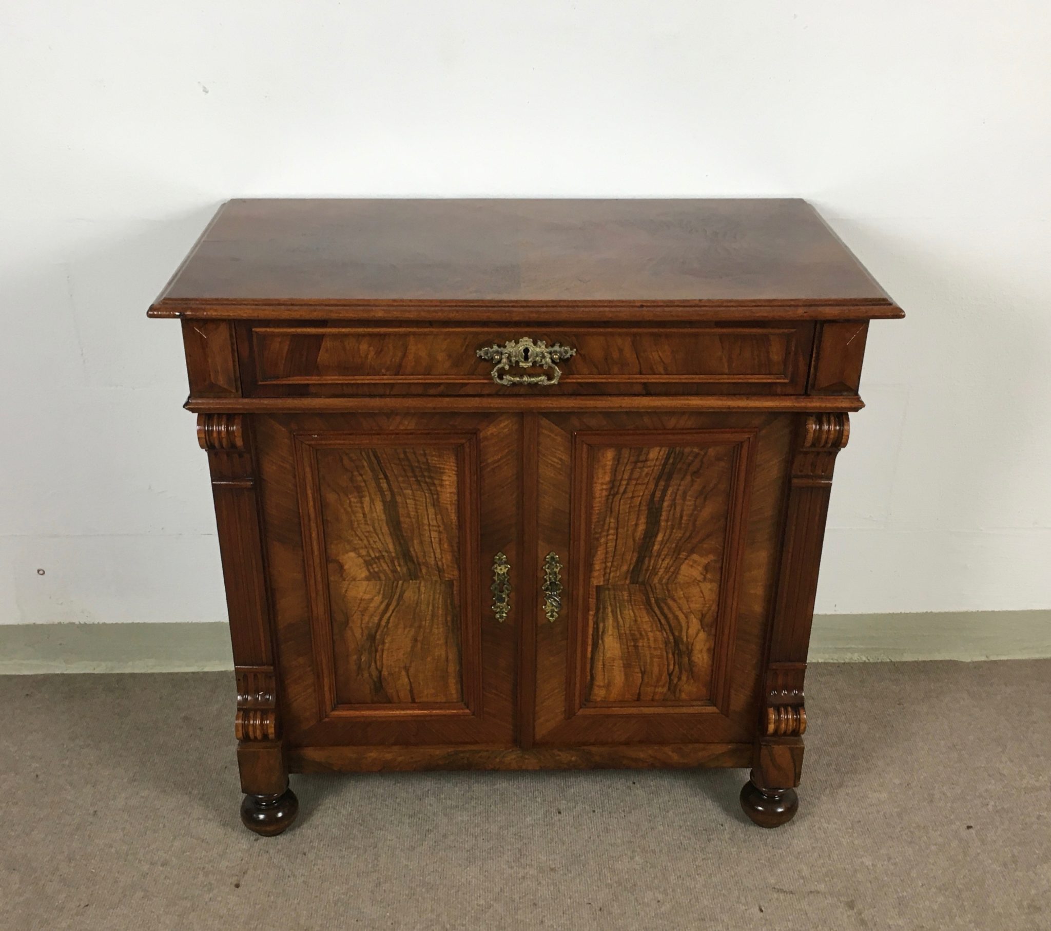 Stilmerkmale: schlichter, geradliniger Korpus, profilierte Deckplatte, Schublade und Türen, Türen flankierende Pilaster mit Rollvoluten am Rahmen, profilierte Kugelfüße, originale Beschläge aus Messing