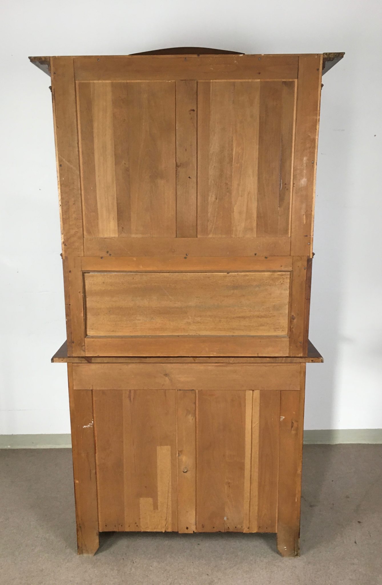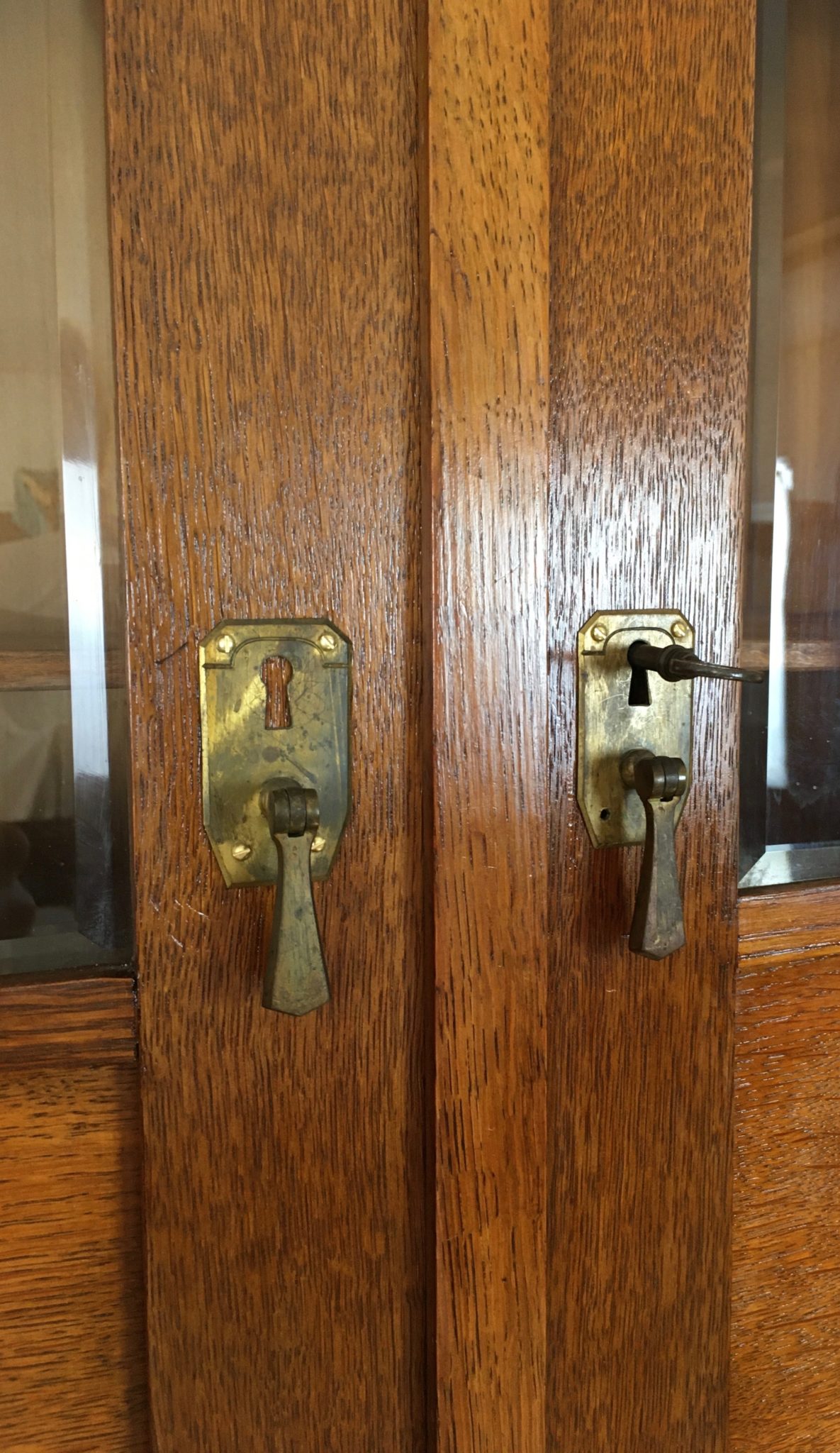 Stilmerkmale: schlichter, Korpus, florale Relief-Schnitzereien, facettierte Scheiben, Zierblendenaufsatz, originale Beschläge aus Messing