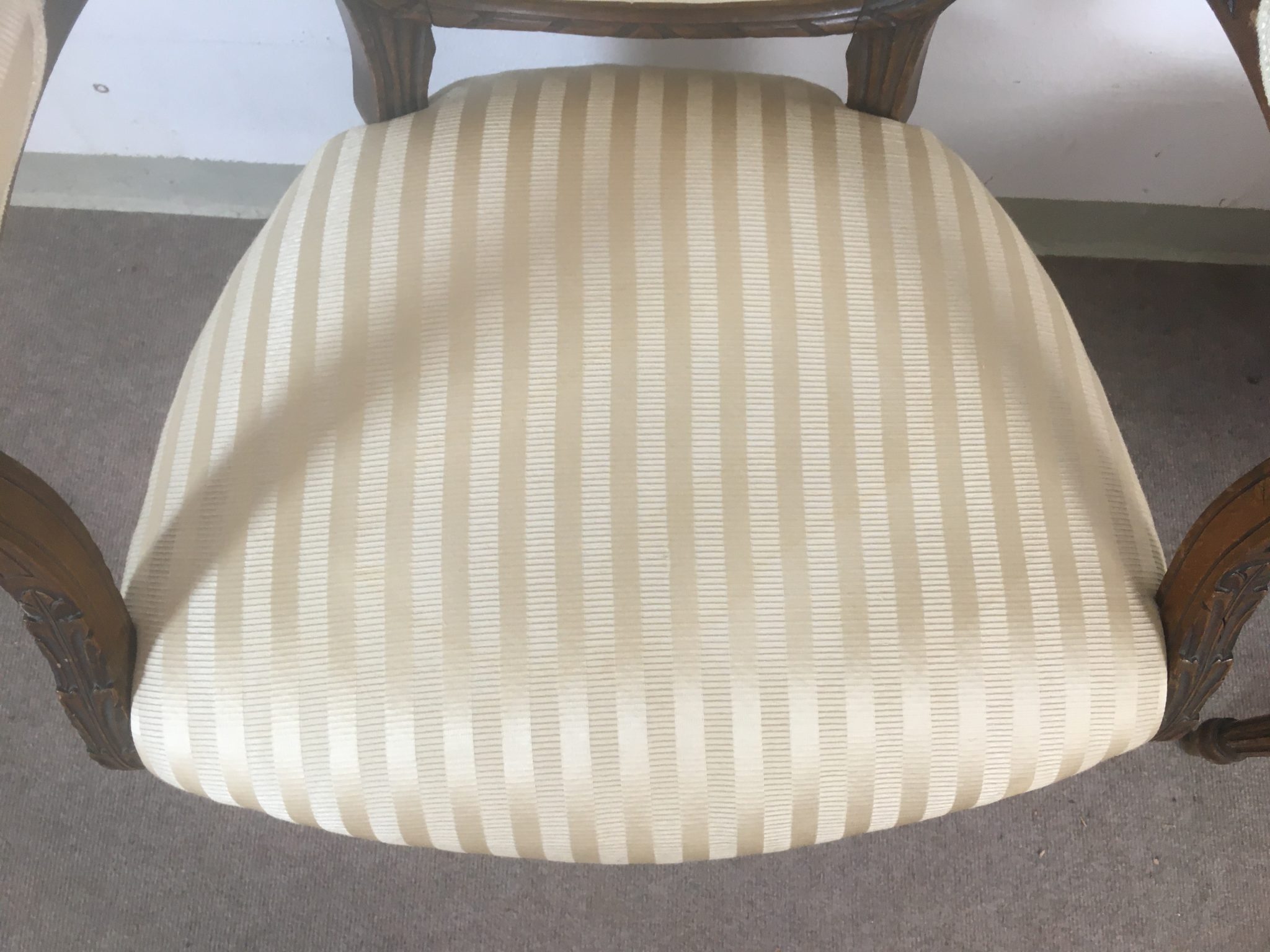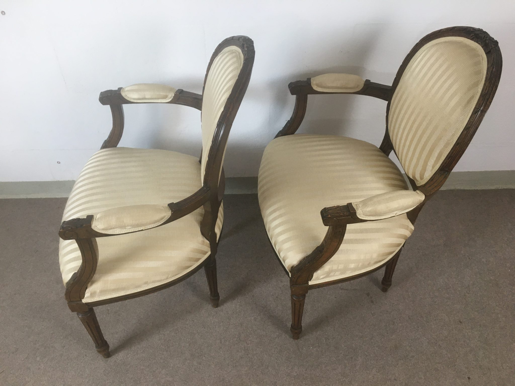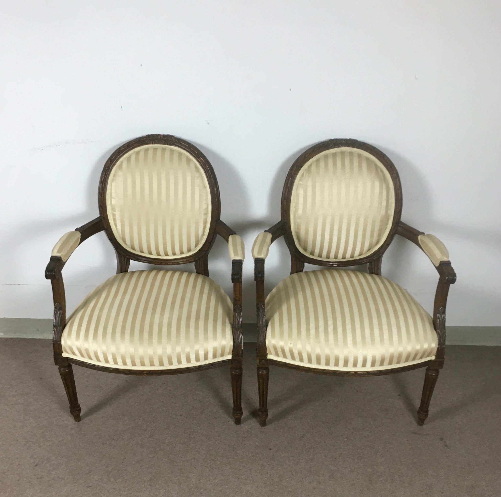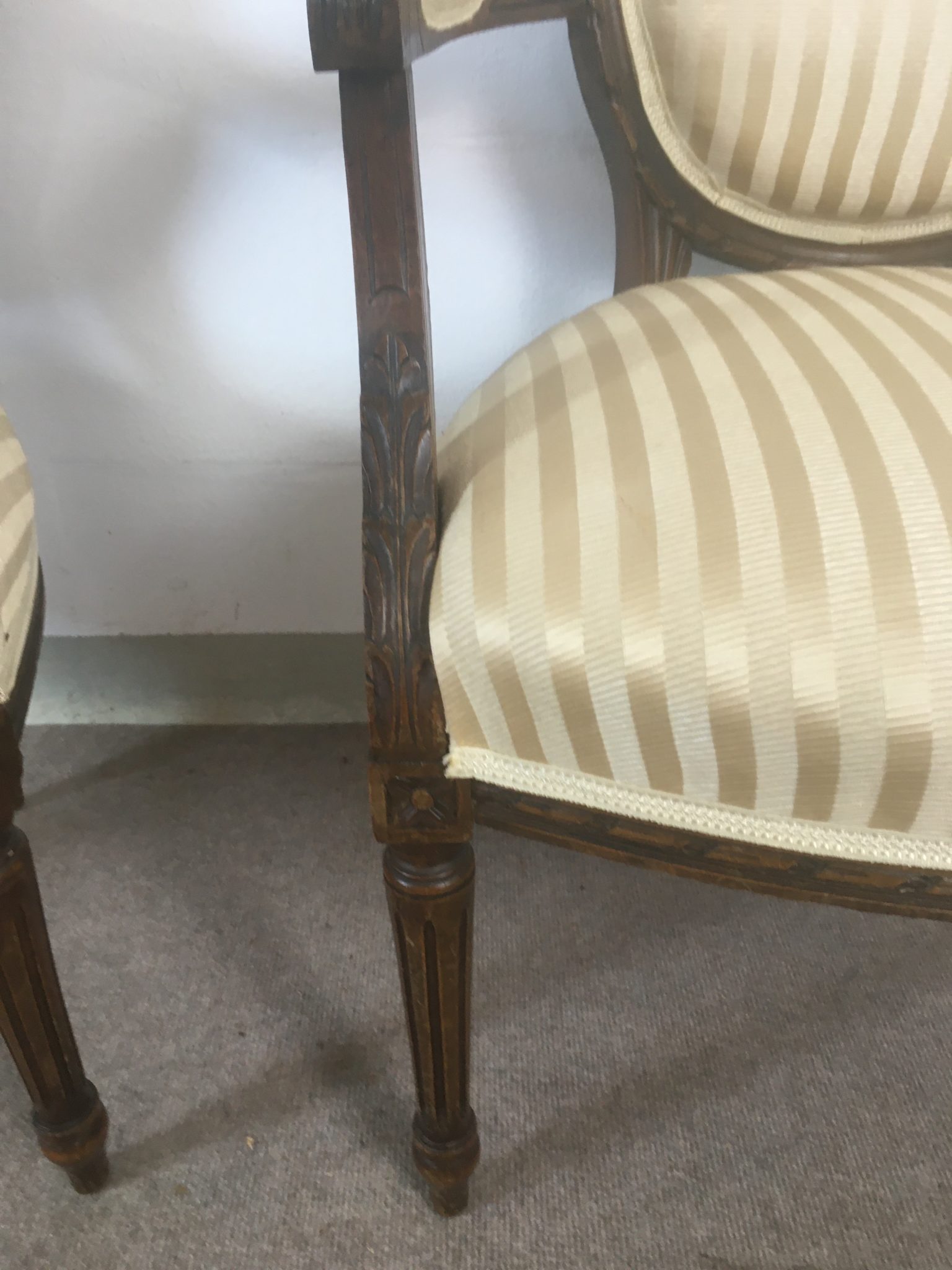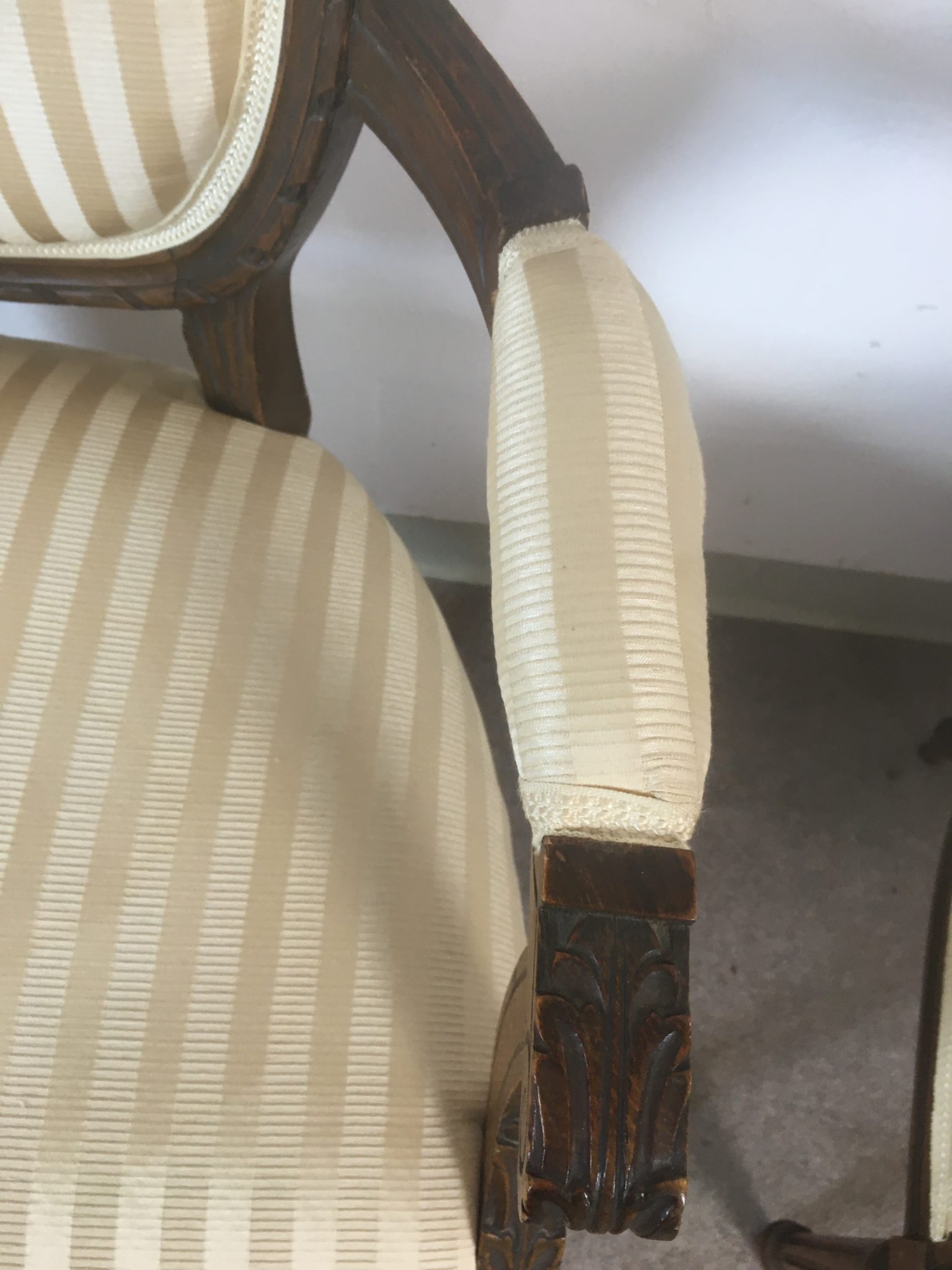 Paar antike Armlehnstühle, Schreibtischstühle, weiß gestreifter Stoffbezug, Hochpolster