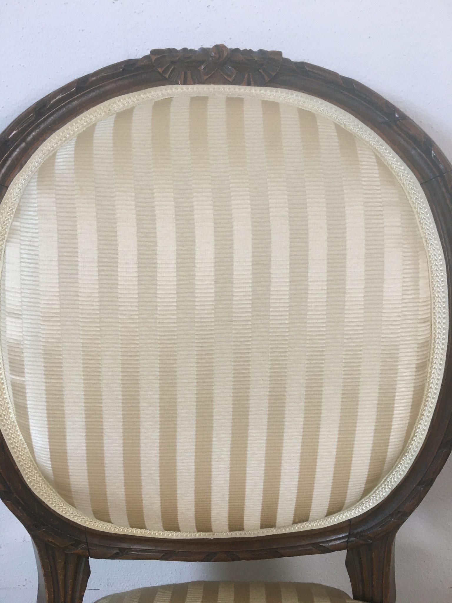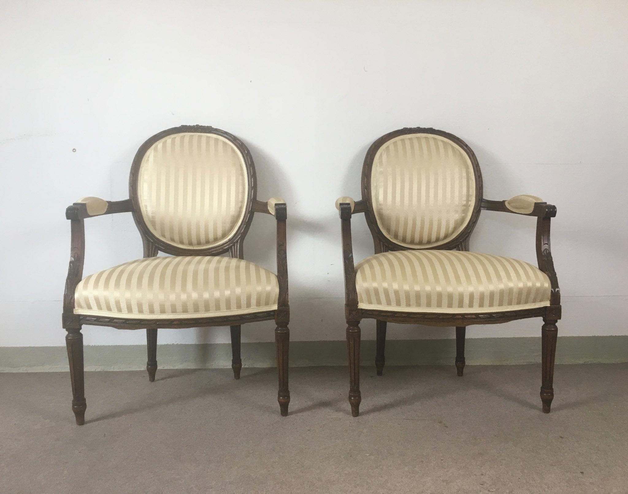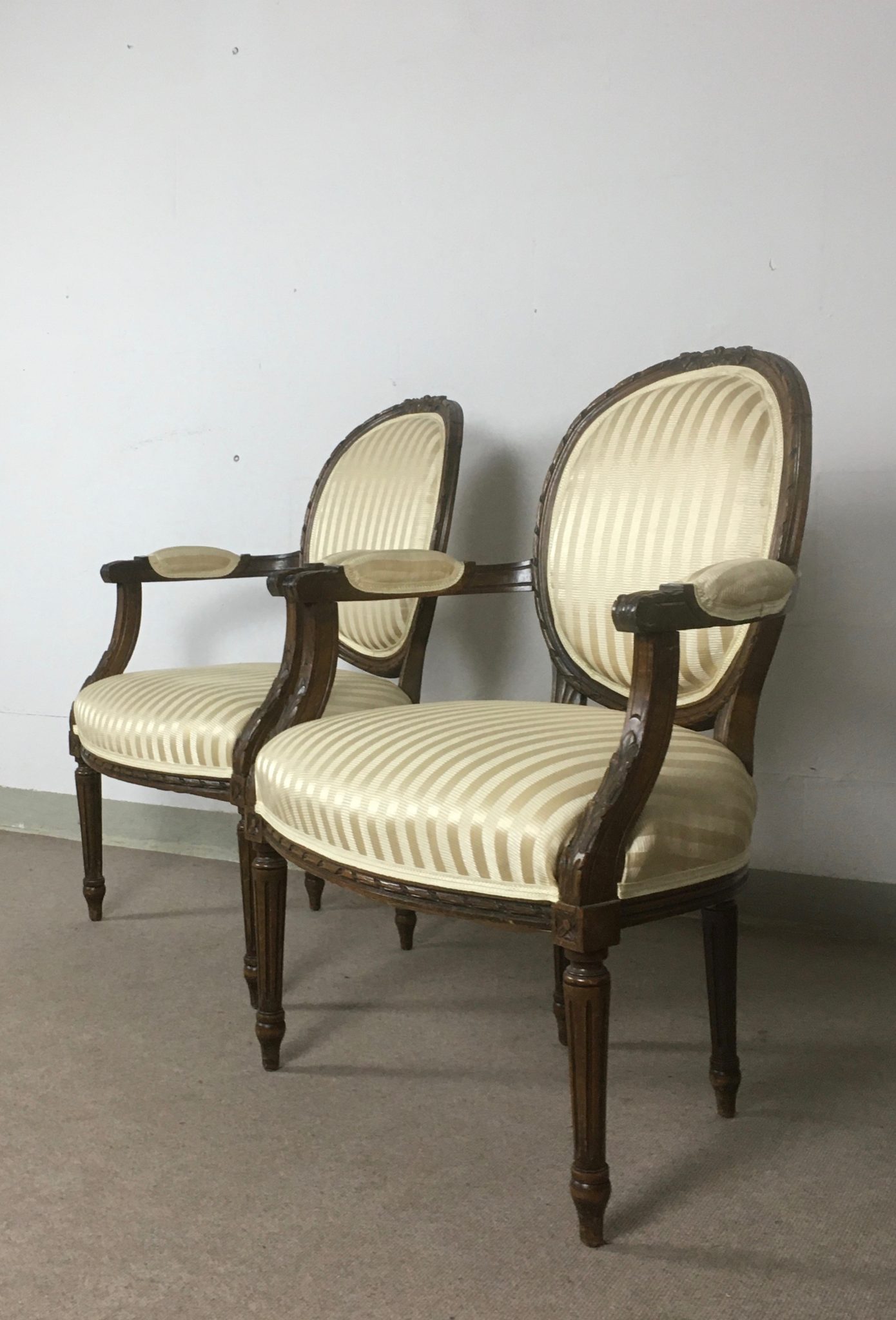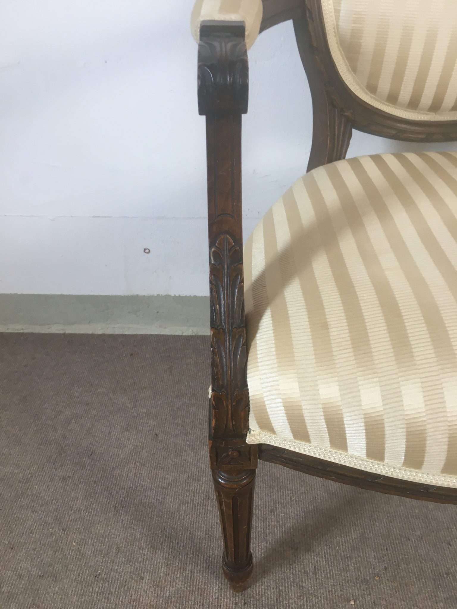 Paar antike Armlehnstühle, Schreibtischstühle, weiß gestreifter Stoffbezug, Hochpolster