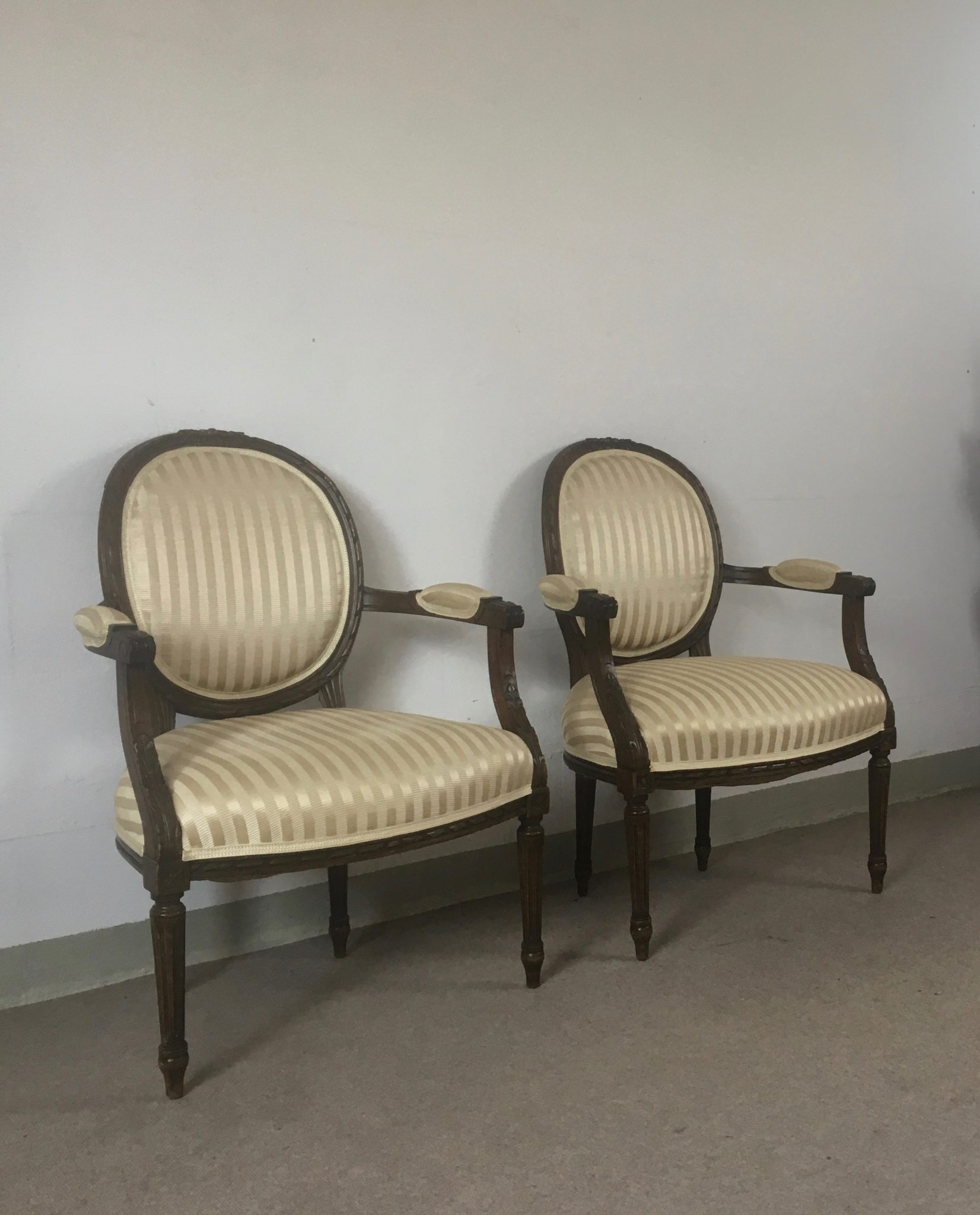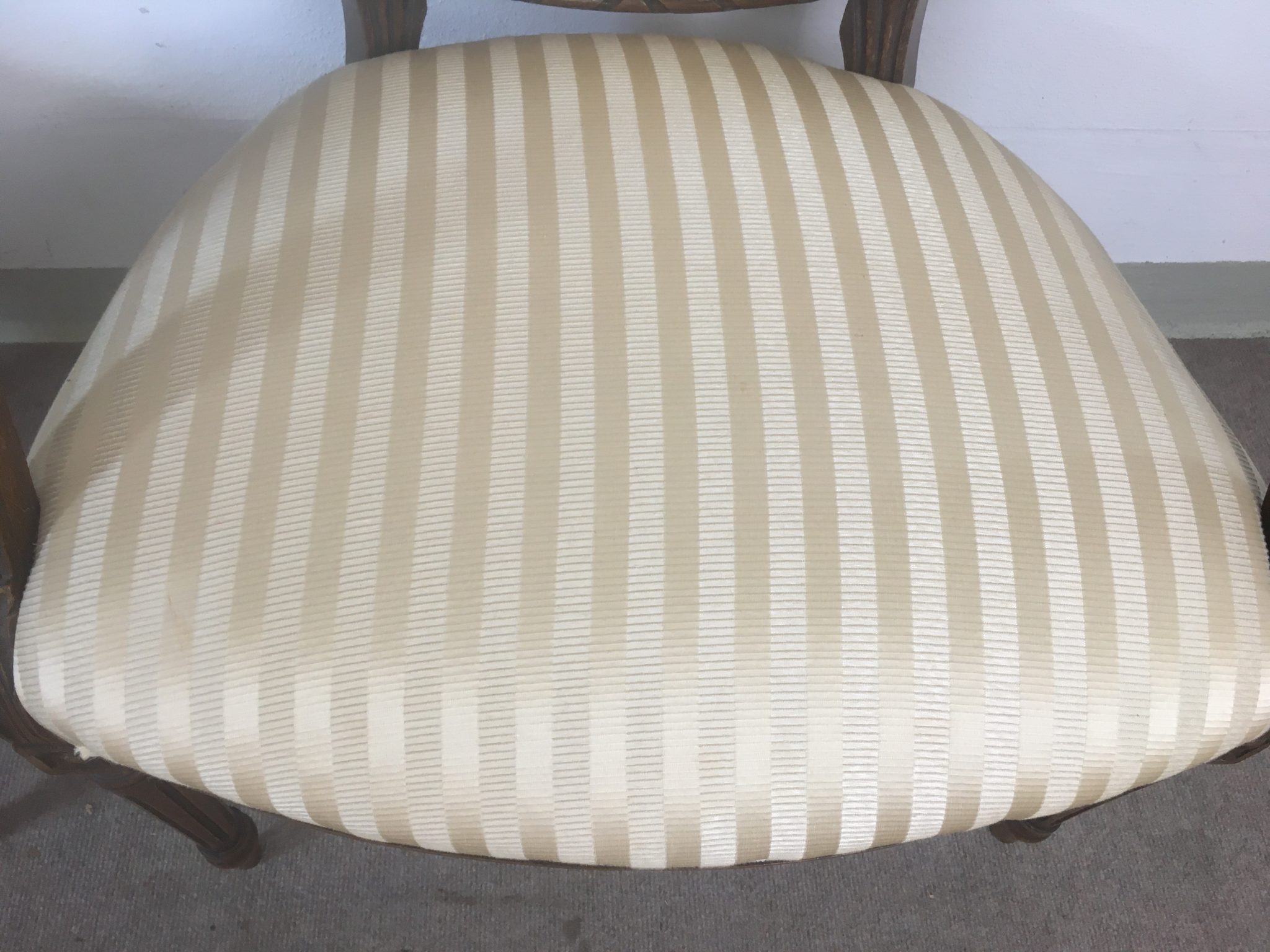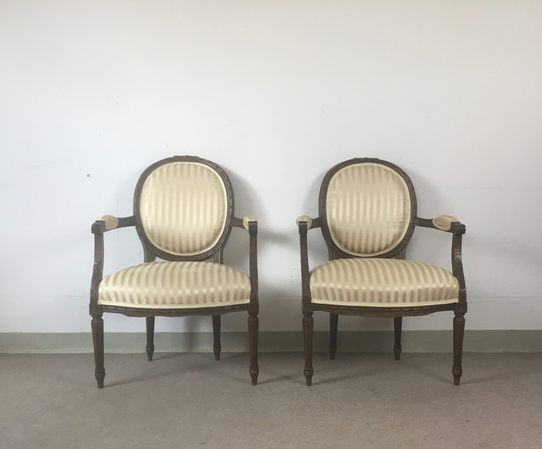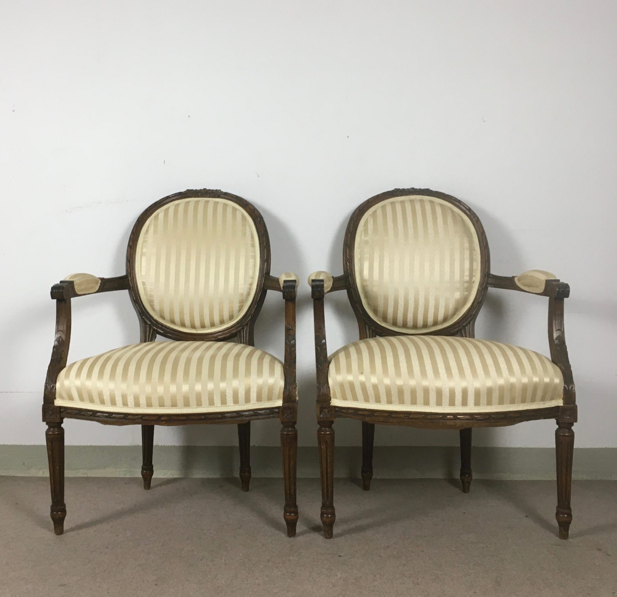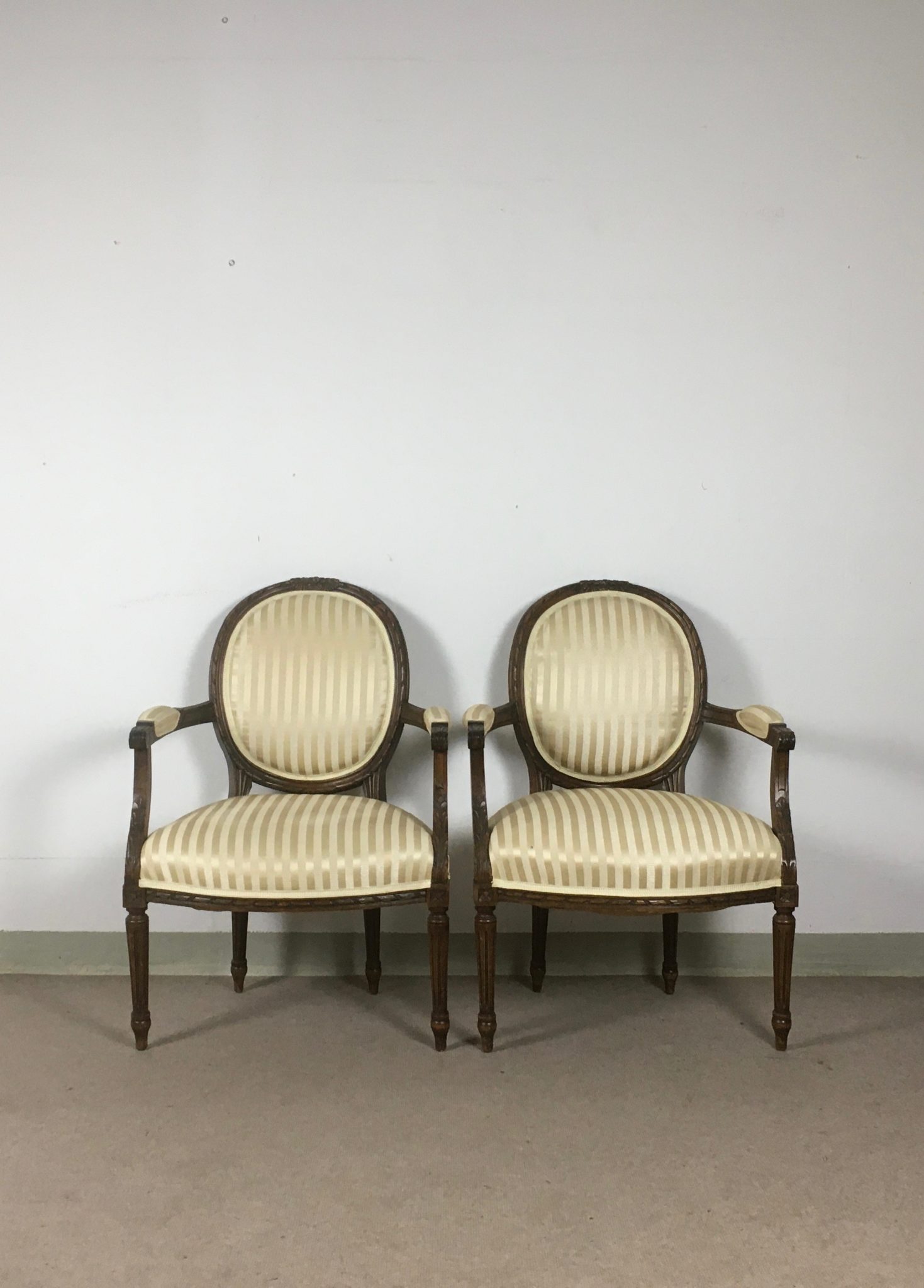 Paar antike Armlehnstühle, Schreibtischstühle, weiß gestreifter Stoffbezug, Hochpolster