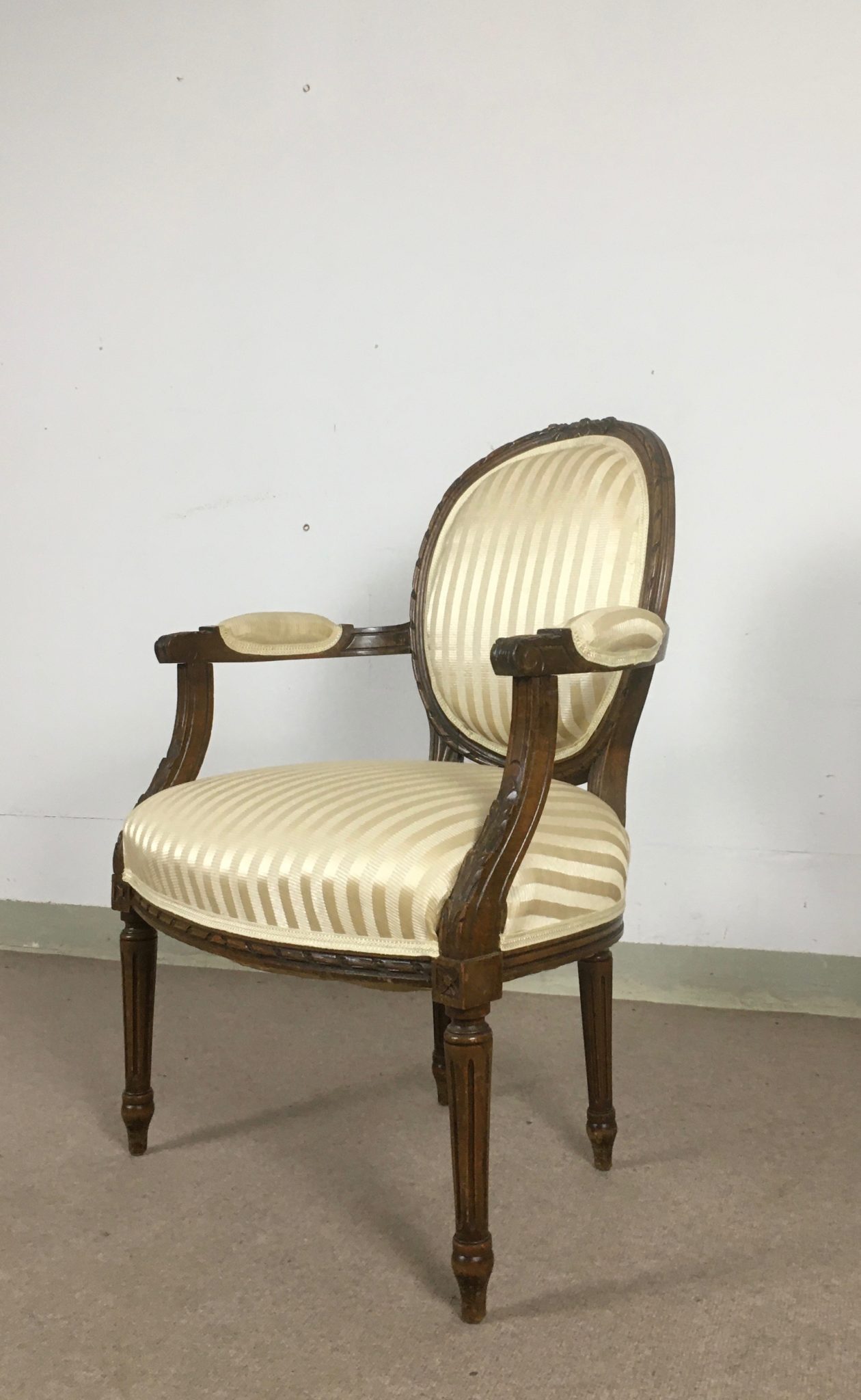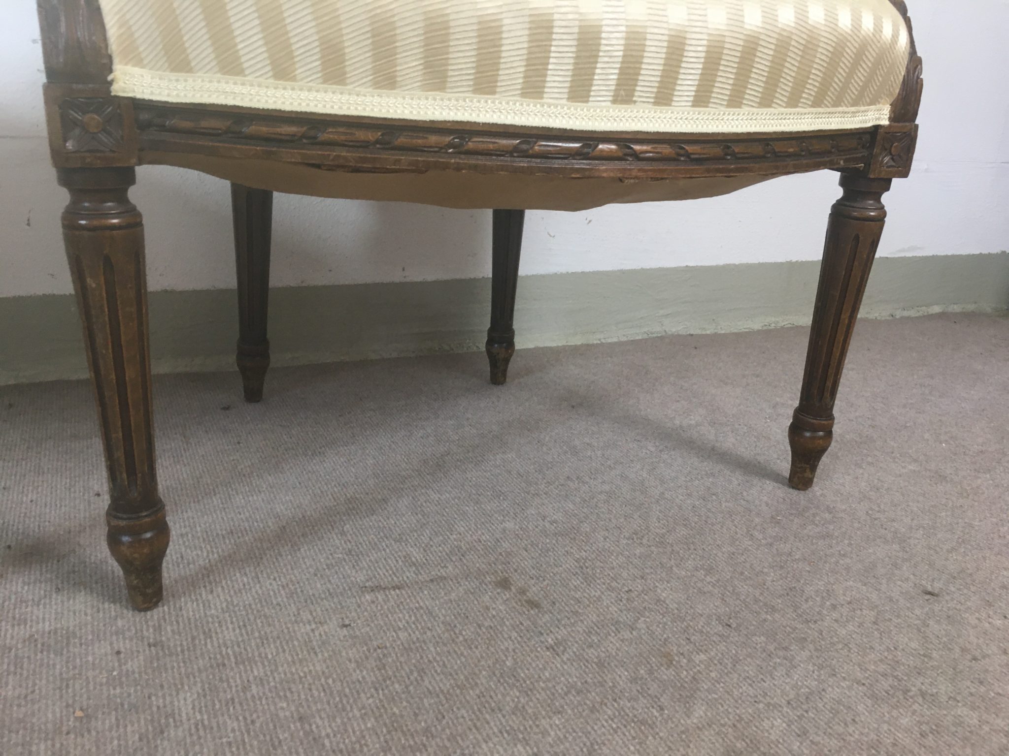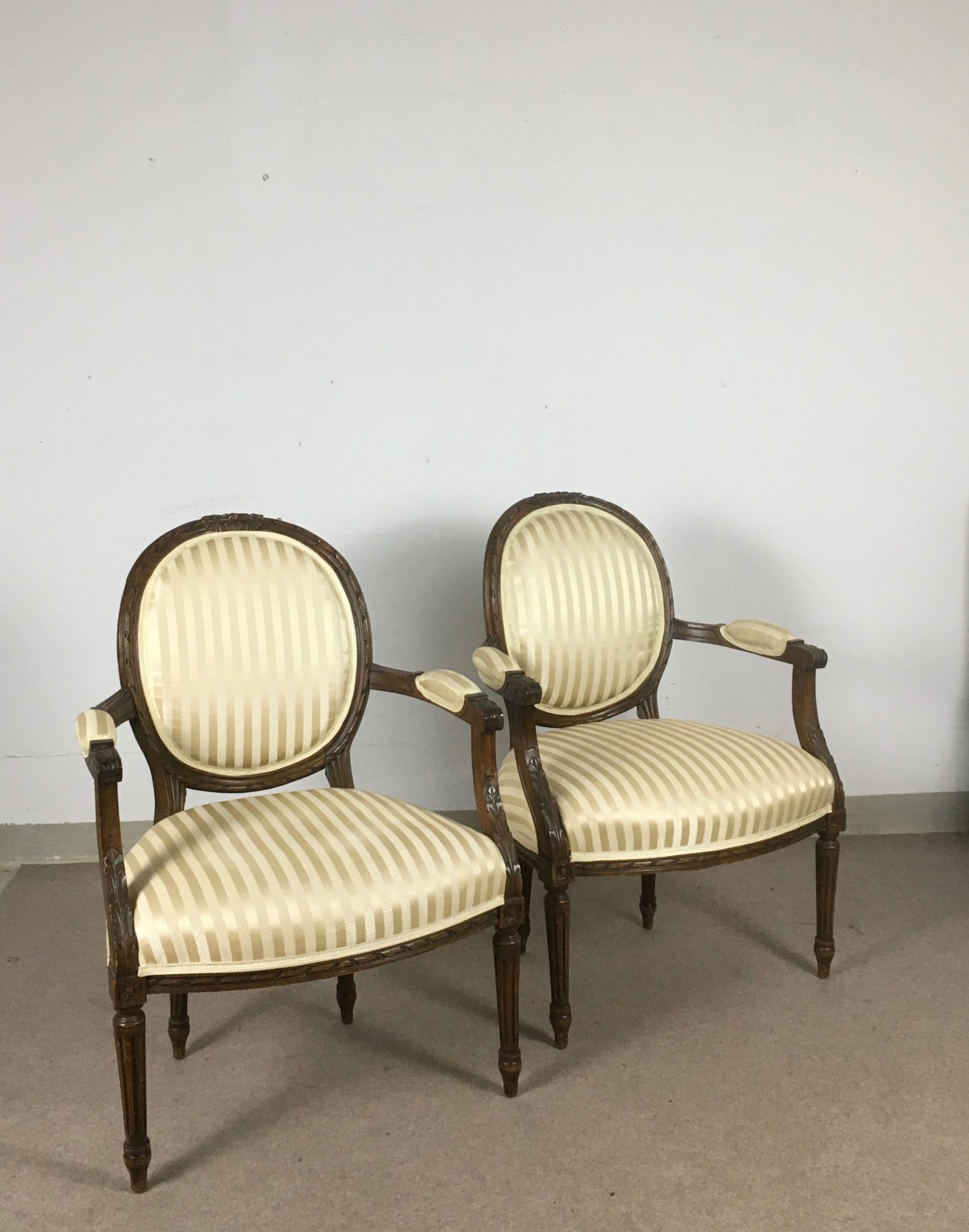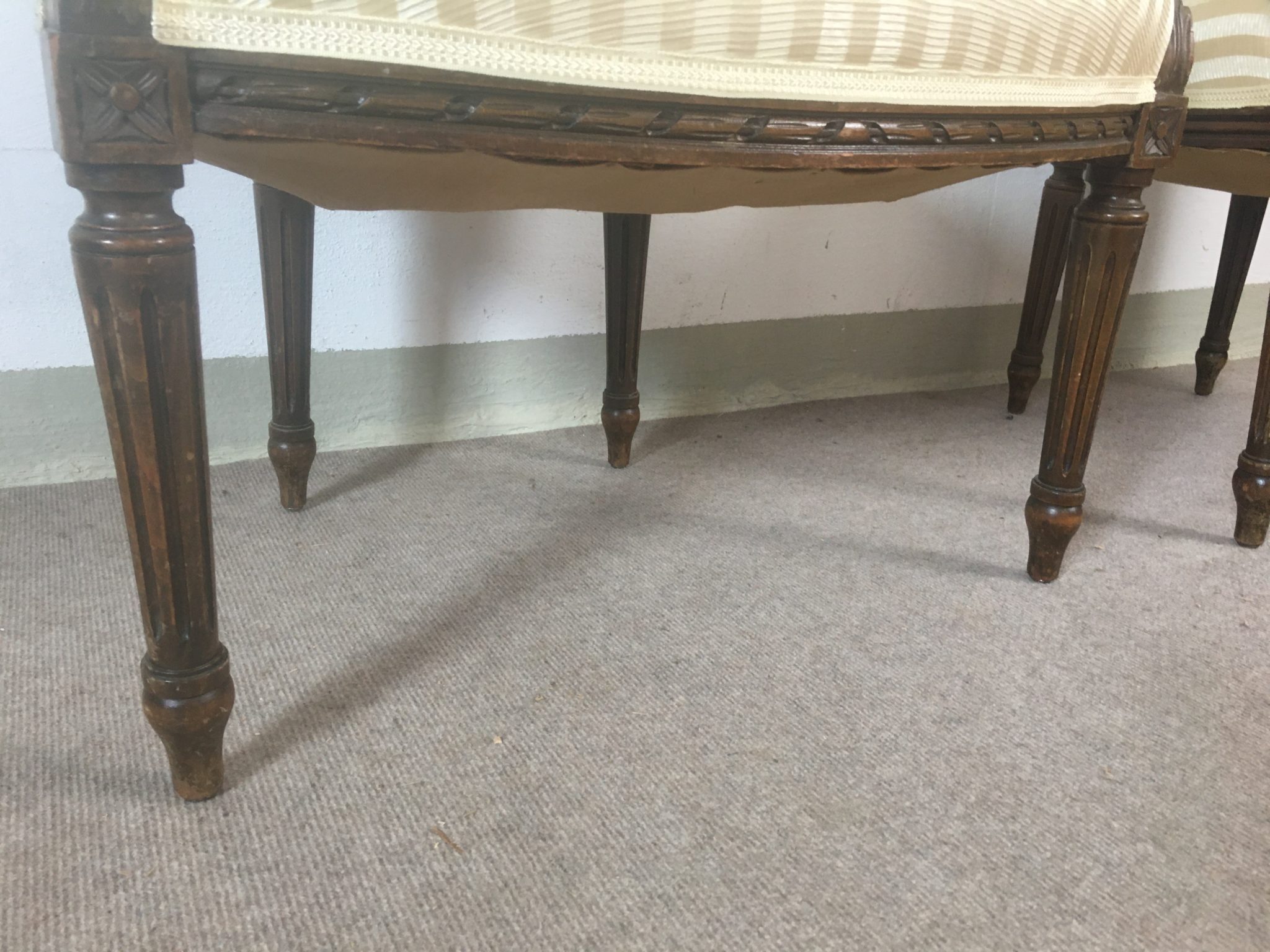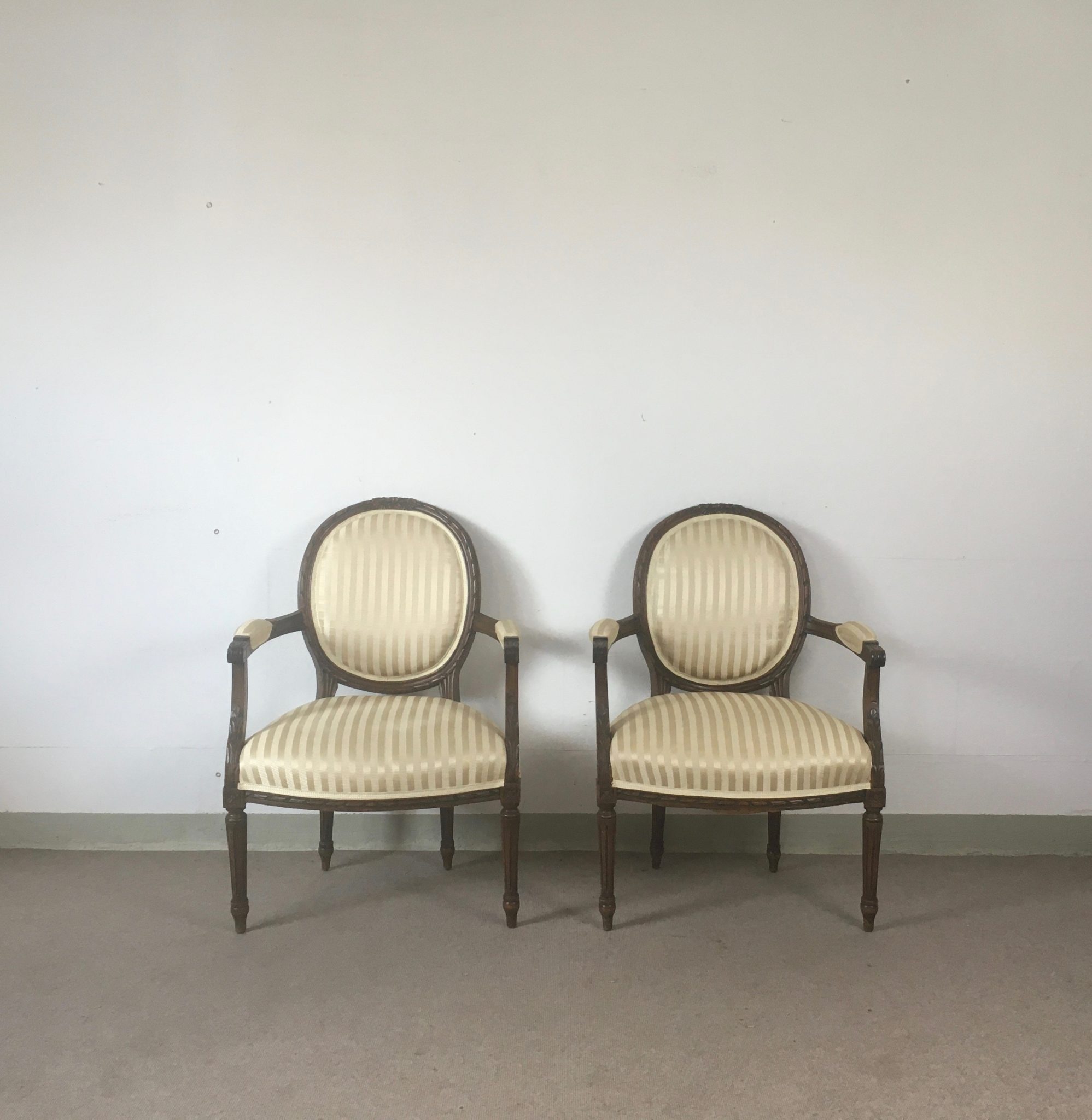 Paar antike Armlehnstühle, Schreibtischstühle, weiß gestreifter Stoffbezug, Hochpolster