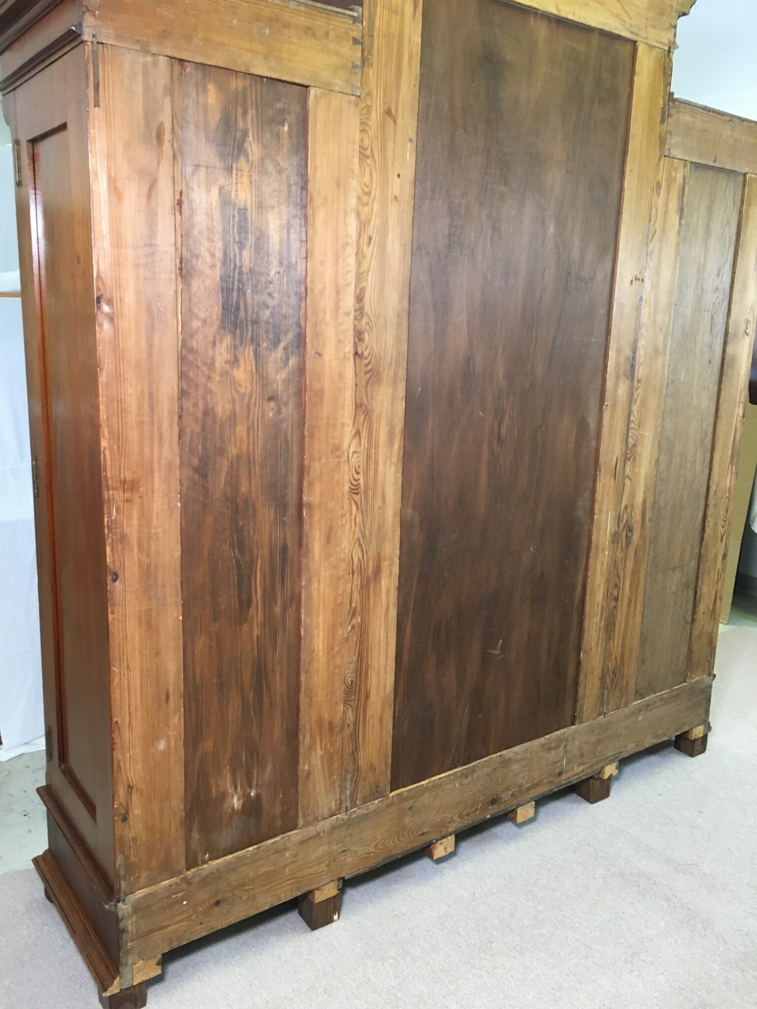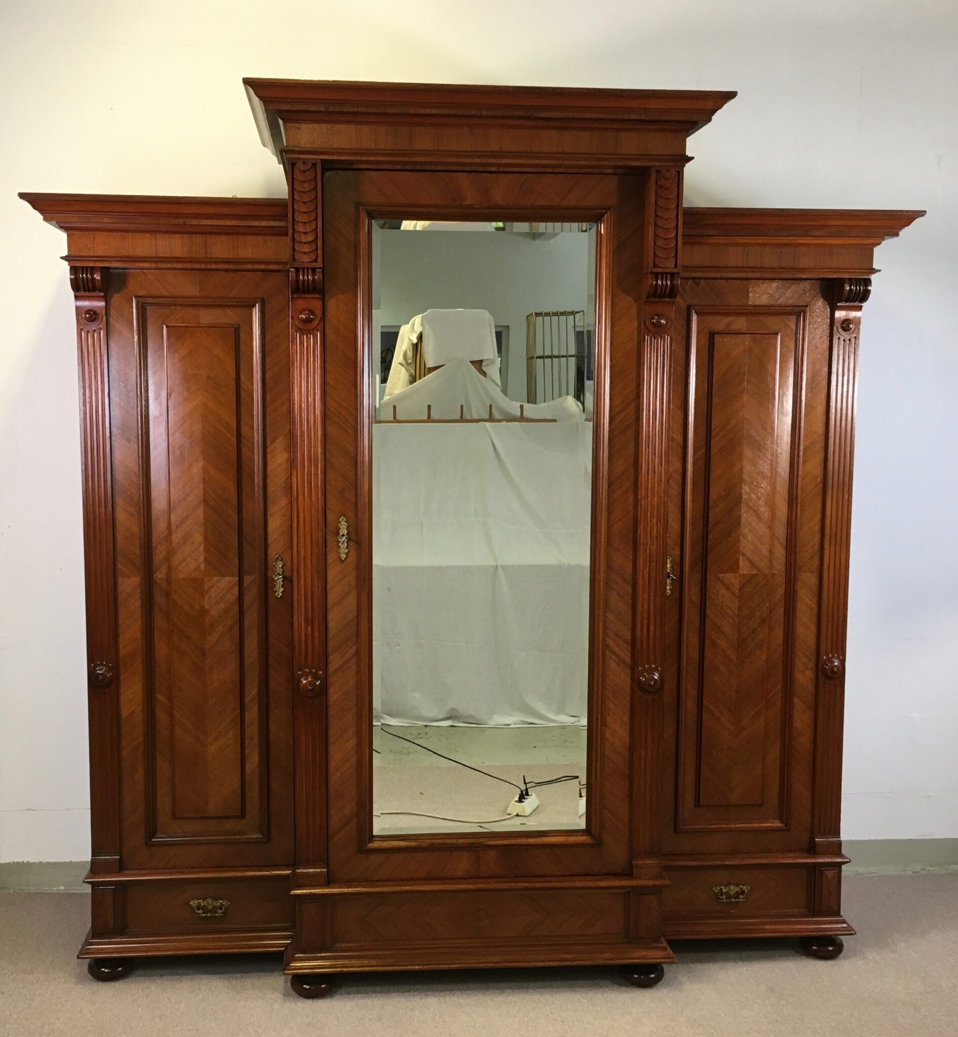 Großer antiker Kleiderschrank, Spiegelschrank, dreiteilig, äußere Schrankteile mit jeweils drei Böden und vier Ablageflächen, Mittelschrank mit originalem Facettenspiegel mit abgeschliffenen Rändern, Innenleben: Ablagebrett und Kleiderstange, KOMPLETT ZERLEGBAR, daher einfach transportierbar.