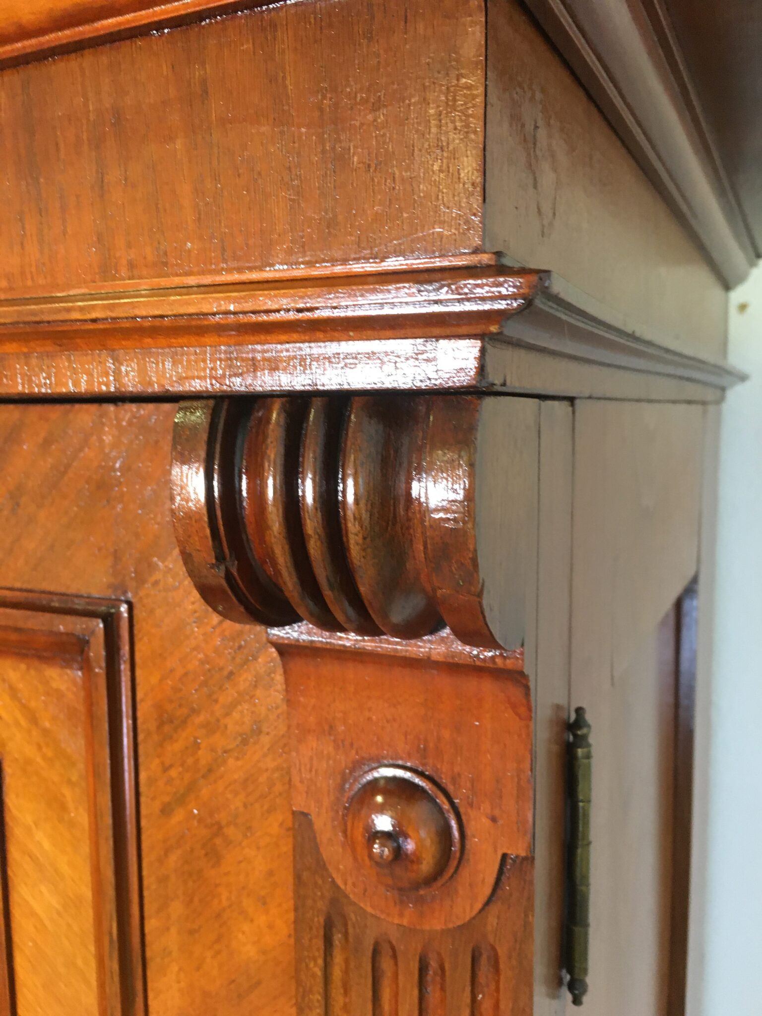 Stilmerkmale: dreiteiliger schlichter Korpus, herausspringender, auskragender Mittelteil, profiliertes Kranzgesims, Münzblattdekor, Pilaster mit Rollvoluten an den Flanken, profilierte Kugelfüße originale Beschläge aus Messing